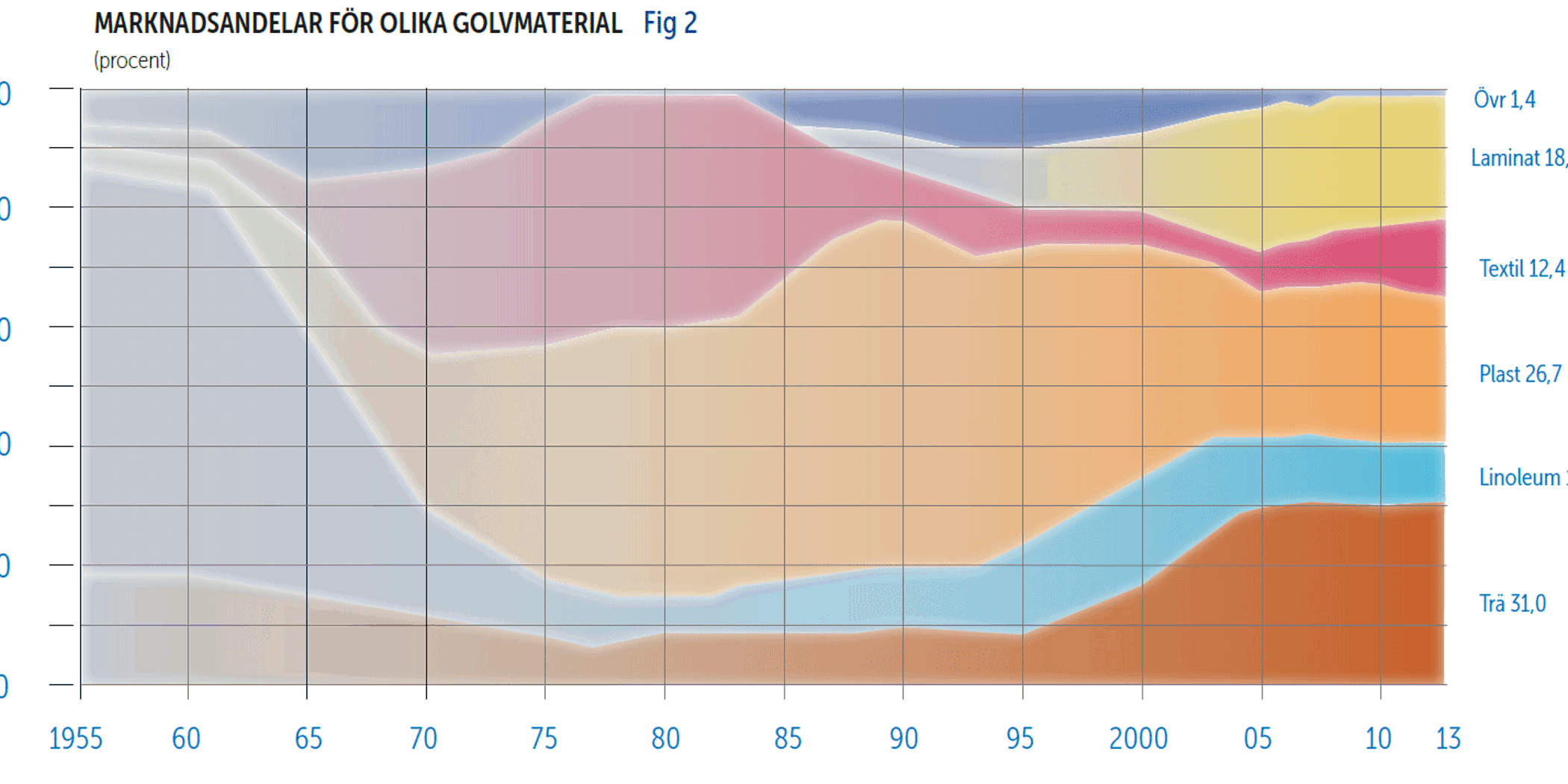 - Försäljning av trägolv är fortsatt stabil, volymen för 2013 är oförändrad. Lamellgolvens andel har ökat något och massiva trägolv har en liten andelsminskning. På totalmarknaden är trägolv fortsatt den största materialgruppen med en marknadsandel på 31 %.