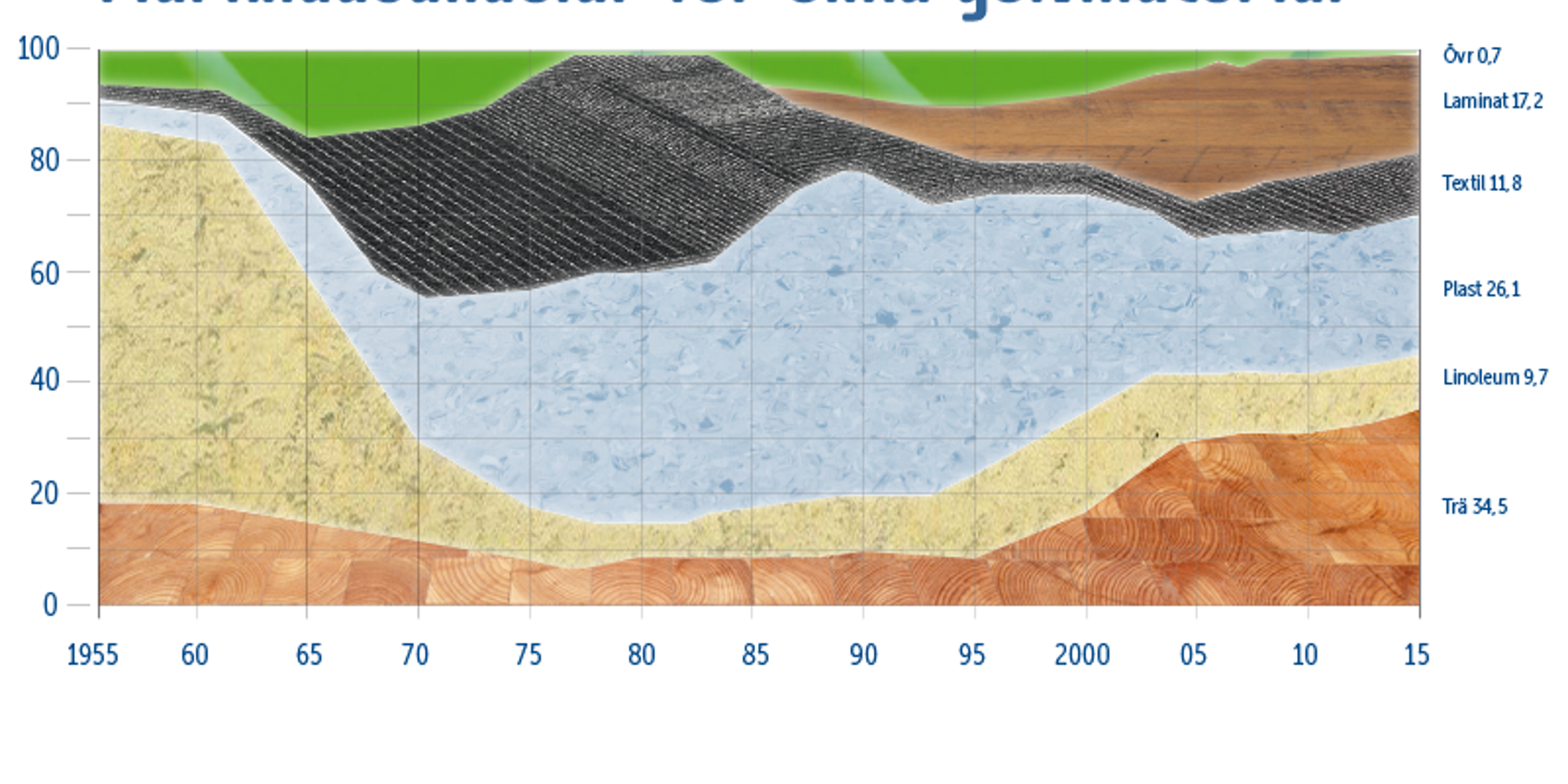 Trä och plast var svenskarnas golvfavoriter förra året. Trägolven ökade sitt redan stora försprång och står nu för nästan 35 procent av golvmarknaden. Försäljningen av plastgolv, främst plattor och homogenmattor, ökade också. Totalt såldes 23,8 miljoner kvadratmeter halvhårda och mjuka golv. Det innebär en rejäl försäljningsökning med 1,9 miljoner kvadratmeter jämfört med 2014.