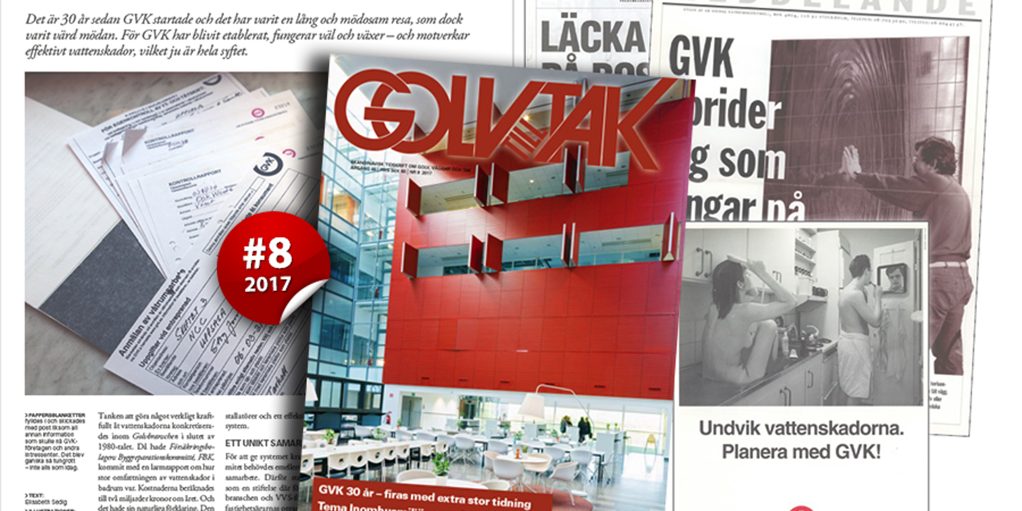 Ja, till och med den berömda nakenchocksannonsen finns med i detta fullmatade nummer av Golv till Tak när GVK fyller 30 år! Läs hela historien om hur GVK gått från att vara en idé på papper till att bli en självklarhet för konsumenter, byggaktörer, mäklare och försäkringsbolag. Milstolpar i utvecklingen mot vattensäkra badrum och pionjärminnen från tre profiler som varit med hela vägen är en del av innehållet, liksom hur GVK möter framtiden med digitala kurser. Lite annan läsning får också plats, till exempel hur golvkonstruktioner kan skapa skön värme i huset.