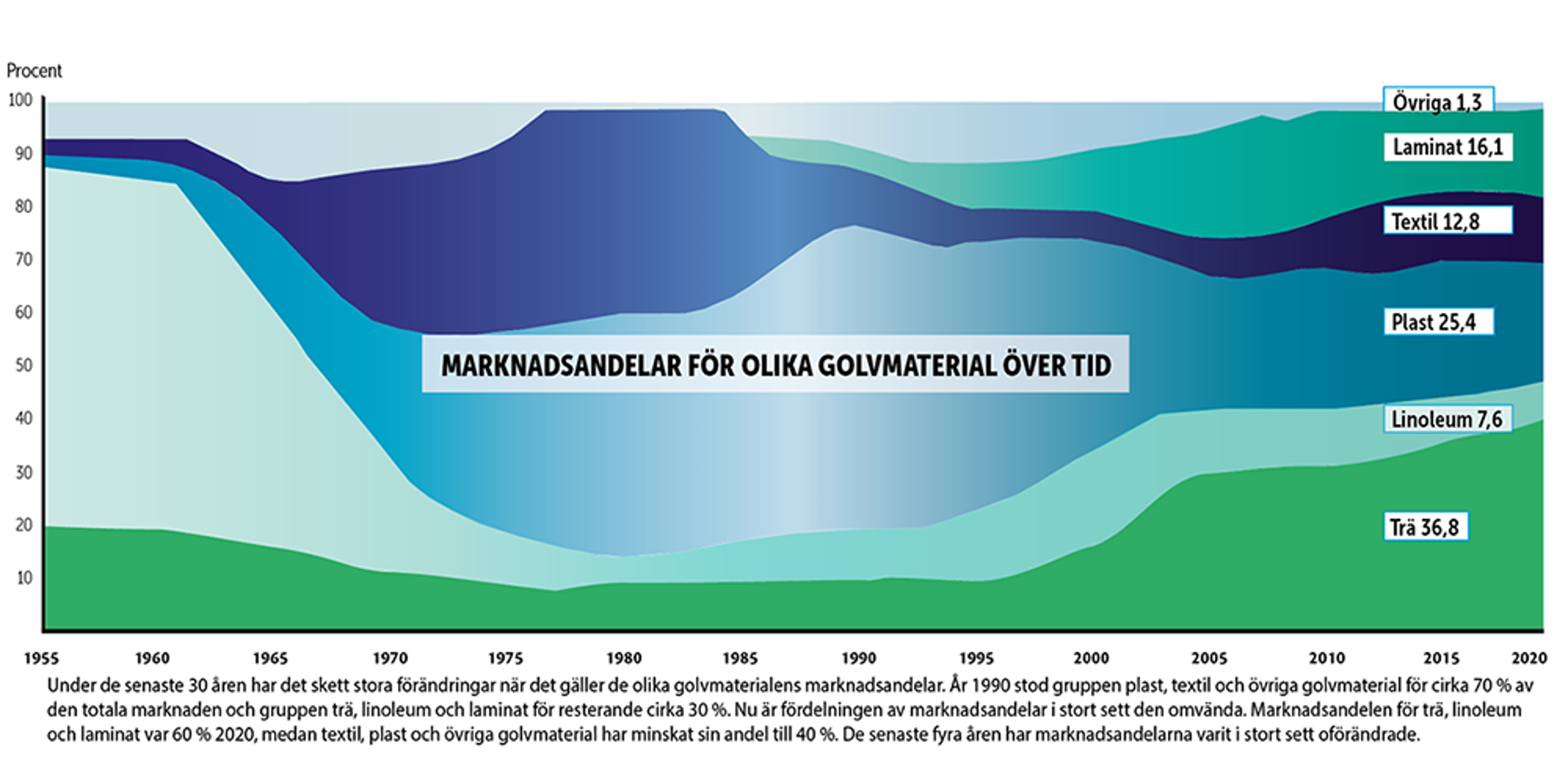 Fördelningen mellan de olika golvmaterialen har i stort sett varit konstant de senaste åren. Gruppen trägolv behåller förstaplatsen och ökar något, främst inom massiva trägolv men även fanér. Plastgolv är fortsatt den näst största materialgruppen men backade under året med drygt 4 procent. Även segmentet textilgolv minskade markant liksom linoleumgolv som föll med hela 11 procent efter att i flera år ha legat på en stabil nivå.