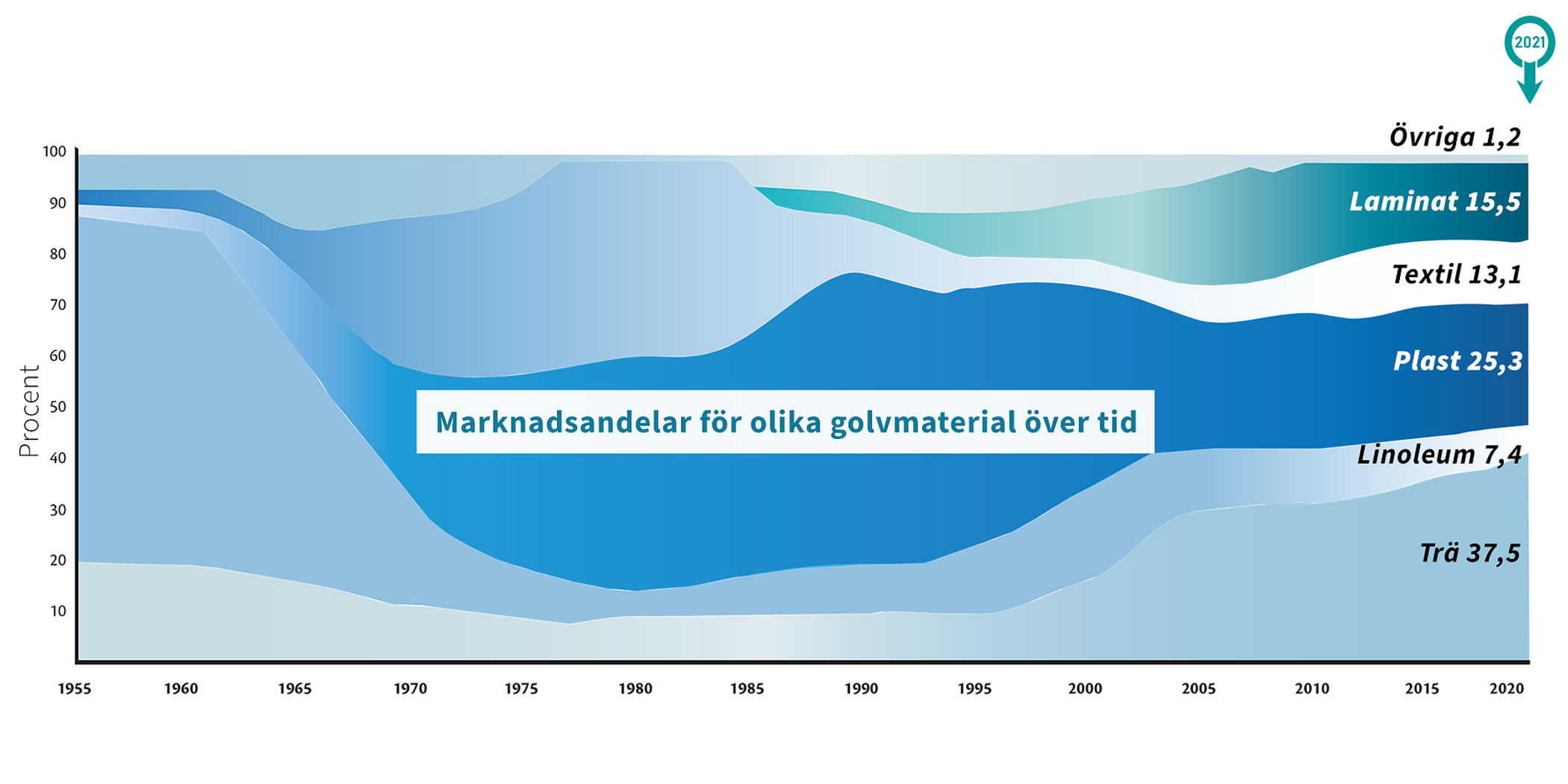 Trä är fortfarande den absoluta favoriten när svensken väljer golvmaterial. Det visar Golvbranschens statistik för helåret 2021, där trägolven ökar till 37,5 procent av den totala golvmaterialmarknaden. Som god tvåa kommer plast med drygt 25 procent. Det är en oförändrad andel jämfört med året innan. Försäljningen av laminatgolv minskade medan segmentet textil ökade sin marknadsandel.