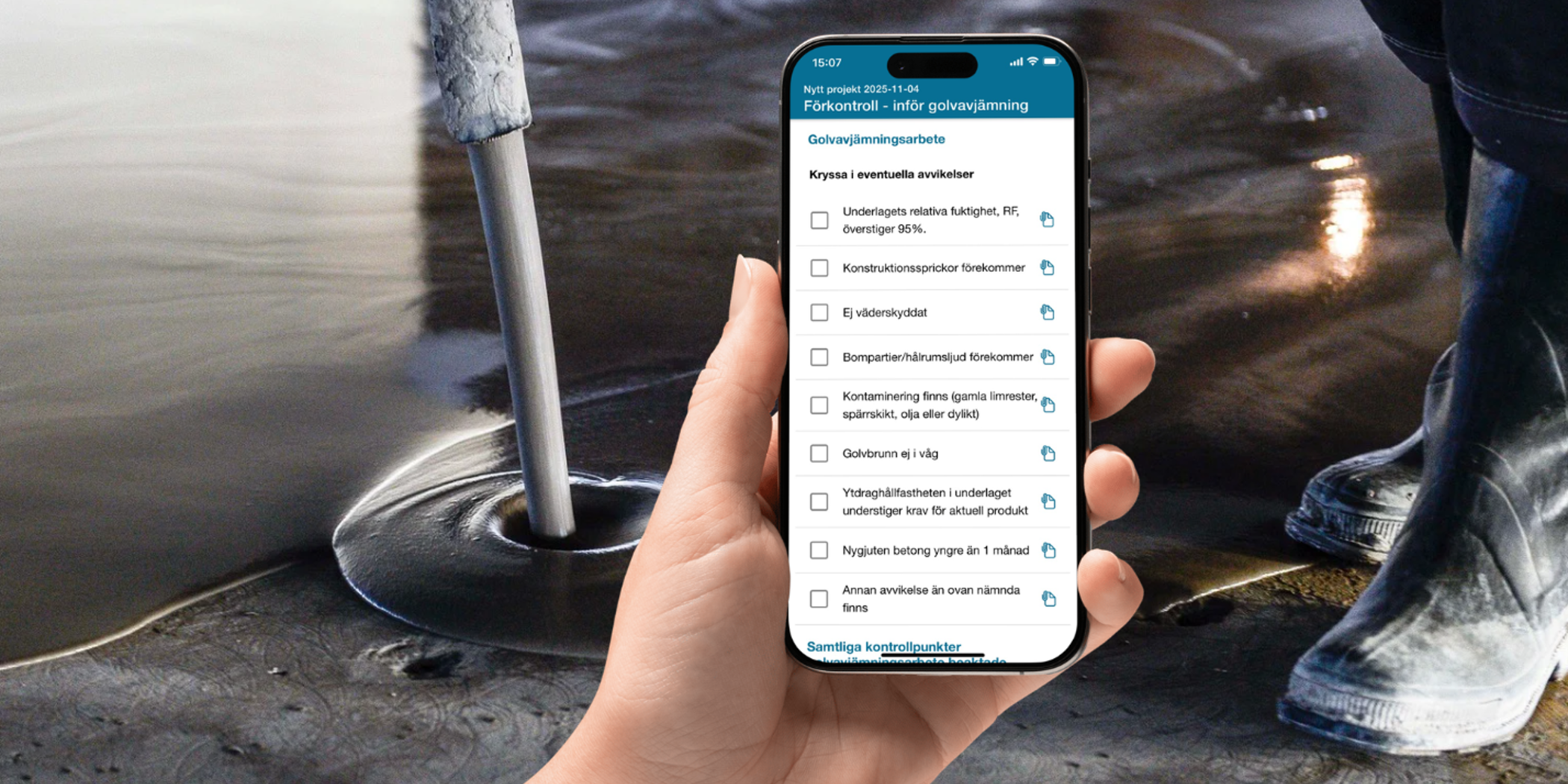 Sedan tidigare har ytskiktsarbeten i torra utrymmen och tätskiktsarbeten i våta utrymmen kunnat dokumenteras. Nu är appen kompletterad med dokumentation av golvavjämningsarbeten. Appen innehåller de kontrollpunkter som är relevanta för dokumentationen, både av förutsättningar och av utfört arbete.